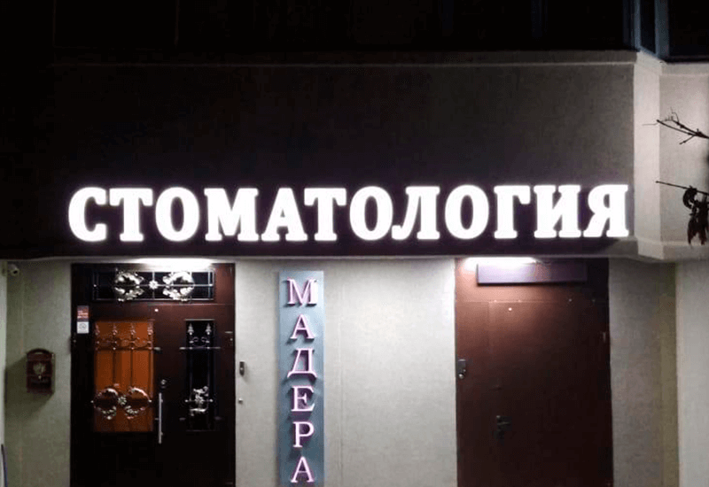 90% всех уличных вывесок это объемные буквы с фронтальной (лицевой) подсветкой. Борта и тыльная часть – ПВХ, лицевая – молочный акрил. Имеют внутреннюю подсветку яркими светодиодными модулями. Есть возможность размещения букв, как на раме в цвет фасада, так и на подложке. Самая низкая стоимость изготовления из всех световых букв, отличная читаемость, большой выбор вариантов исполнения делают эту вывеску лучшим выбором для размещения на улице.